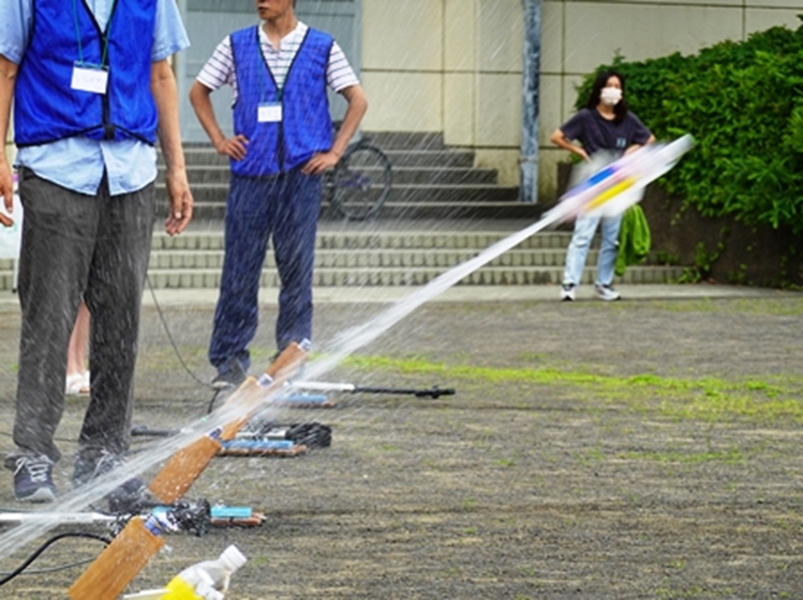 前述のペットボトルロケットの「発射装置」は、自転車の空気入れと100円ショップで手に入るパーツを使いながら、指導者が工夫してこしらえたものですが、毎年改善を重ねていって、ことしの装置は、発足当初のものより格段に洗練されたものになっていました。